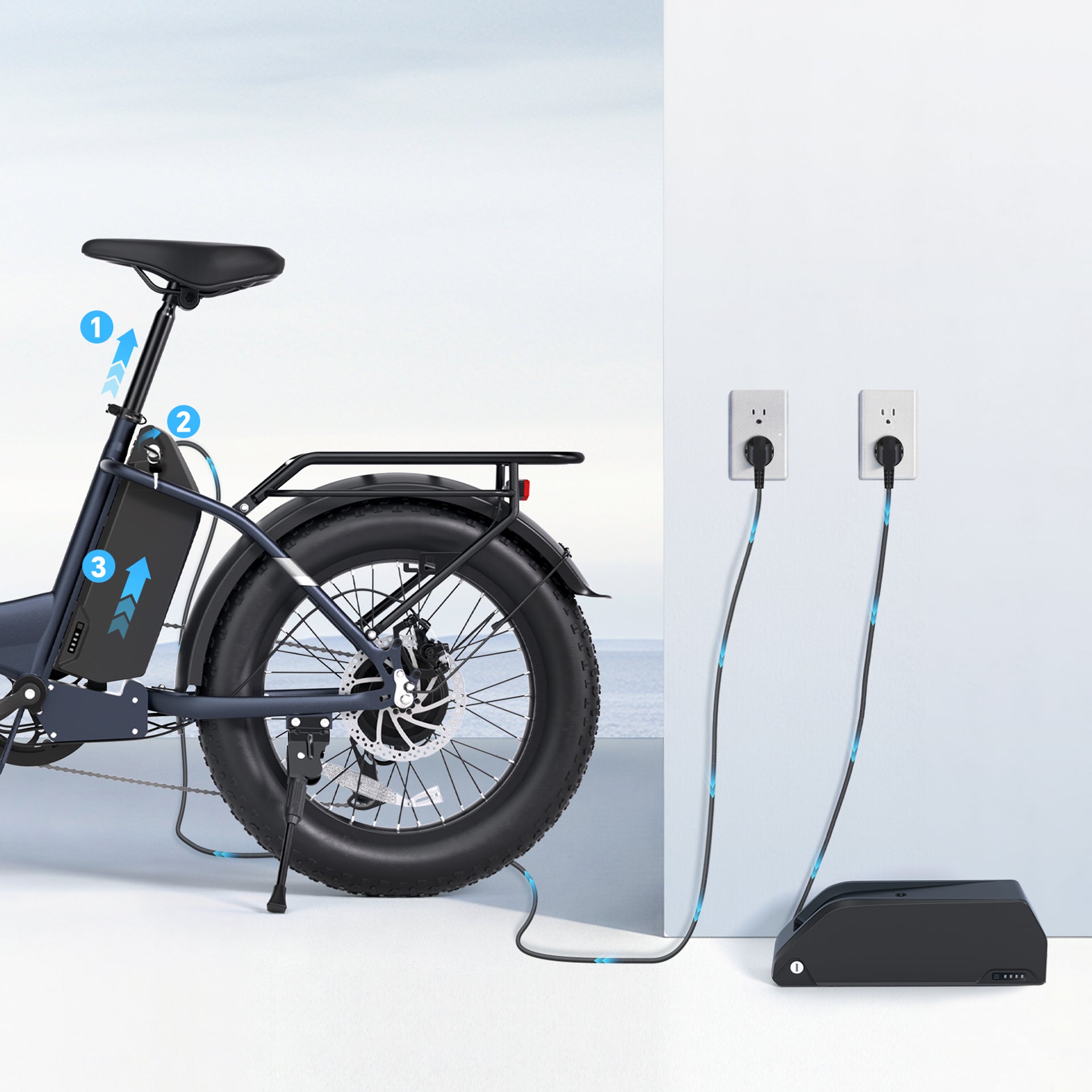 You can recharge the battery pack by plugging the charger into a standard wall outlet. The battery can be charged either on or off the bike, giving you flexibility and ease.