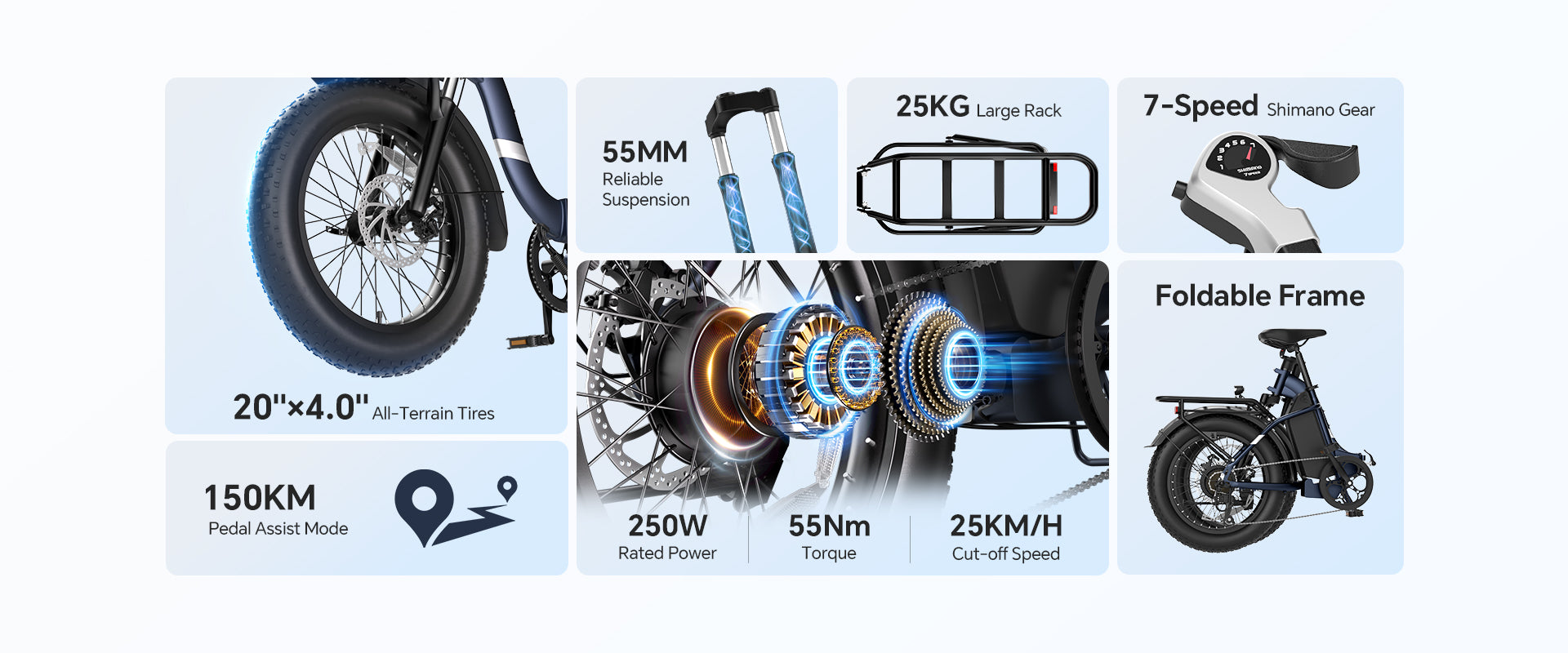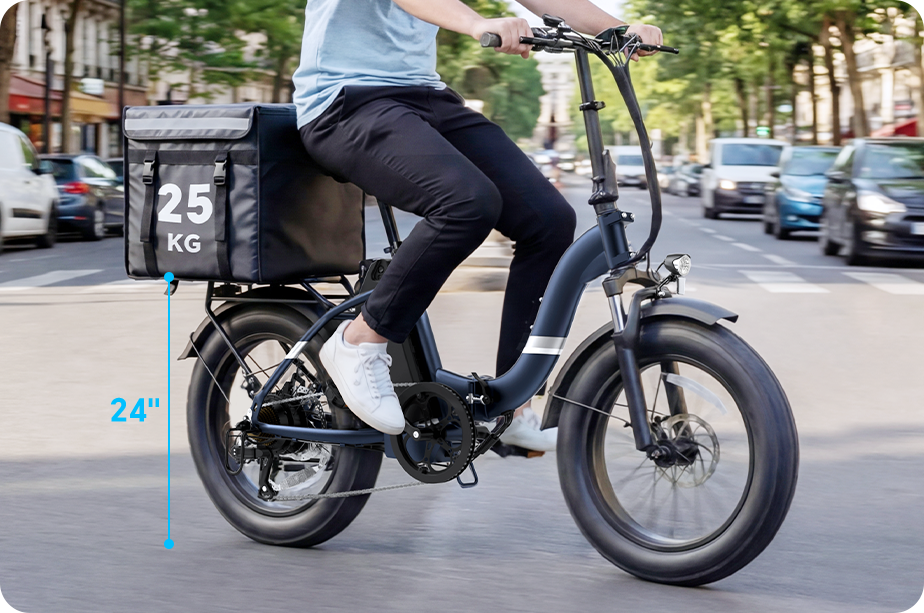 The bike weighs around 31kg, which is typical for a 20-inch fat tire e-bike. While it may be heavier than some other e-bikes, the sturdy build ensures durability and stability on all terrains.
