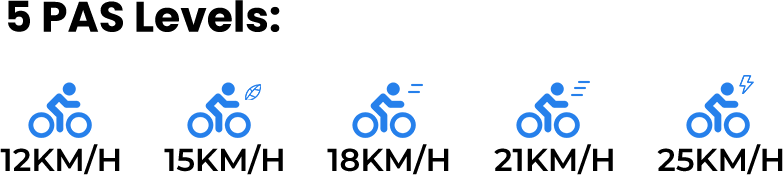 Niveles de velocidad del modo de asistencia: 12/15/18/21/25 km/h (nivel 1-5)