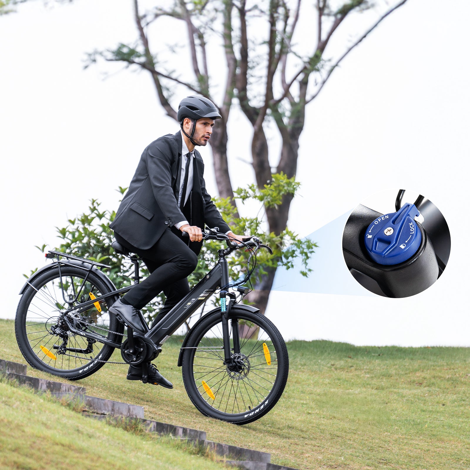 Ride comfortably with a front suspension fork that absorbs bumps and vibrations, allows ride smoothly in different conditions.