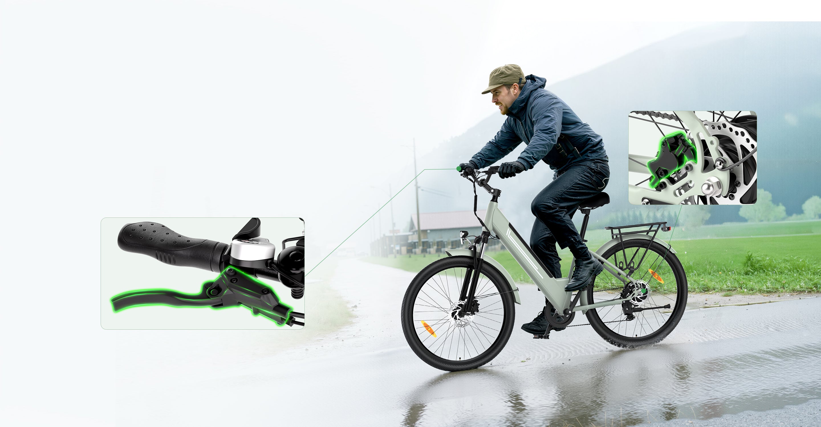 The bike has an IPX4 waterproof rating, meaning all electronic components are water-resistant but not fully waterproof. We recommend avoiding heavy rain or severe weather conditions to ensure longevity.